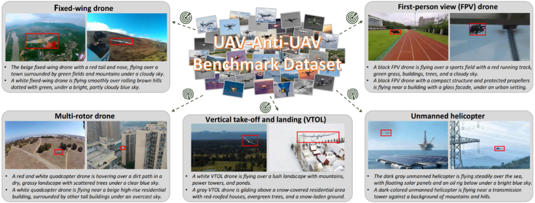 图2:数据集中包含五种不同类型的无人机目标(固定翼、FPV、多旋翼、垂直起降、无人直升机)以及对应的语言描述。